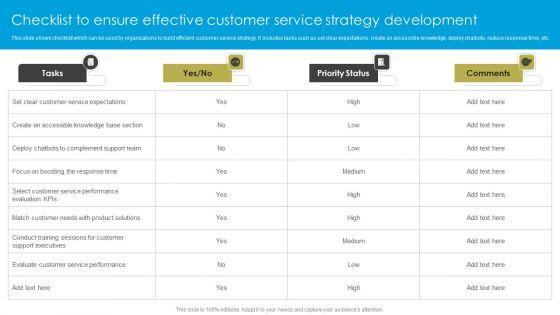 This slide shows checklist which can be used by organizations to build efficient customer service strategy. It includes tasks such as set clear expectations, create an accessible knowledge, deploy chatbots, reduce response time, etc. Want to ace your presentation in front of a live audience Our Client Support Plan To Increase Customer Checklist To Ensure Effective Customer Service Strategy SS V can help you do that by engaging all the users towards you. Slidegeeks experts have put their efforts and expertise into creating these impeccable powerpoint presentations so that you can communicate your ideas clearly. Moreover, all the templates are customizable, and easy-to-edit and downloadable. Use these for both personal and commercial use. This slide shows checklist which can be used by organizations to build efficient customer service strategy. It includes tasks such as set clear expectations, create an accessible knowledge, deploy chatbots, reduce response time, etc.