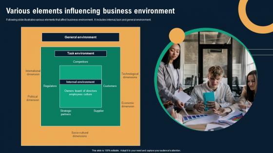 Following slide illustrates various elements that affect business environment . It includes internal, task and general environment. This Various Elements Influencing Business Environment Elements PDF is perfect for any presentation, be it in front of clients or colleagues. It is a versatile and stylish solution for organizing your meetings. The Various Elements Influencing Business Environment Elements PDF features a modern design for your presentation meetings. The adjustable and customizable slides provide unlimited possibilities for acing up your presentation. Slidegeeks has done all the homework before launching the product for you. So, do not wait, grab the presentation templates today