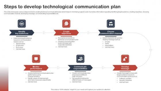 This slide showcases various steps involved in creating technical communication plan which helps in minimizing support costs. It provides information regrading identifying target audience, creating objectives, choosing communication channel, developing message, communicating responsibilities etc. Showcasing this set of slides titled Steps To Develop Technological Communication Plan Elements Pdf. The topics addressed in these templates are Audiences, Create Objectives, Choose Communication Channel. All the content presented in this PPT design is completely editable. Download it and make adjustments in color, background, font etc. as per your unique business setting. This slide showcases various steps involved in creating technical communication plan which helps in minimizing support costs. It provides information regrading identifying target audience, creating objectives, choosing communication channel, developing message, communicating responsibilities etc.