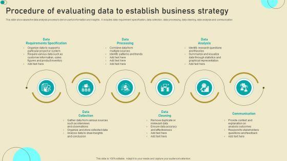 This slide showcases the data analysis process to derive useful information and insights . It includes data requirement specification, data collection, data processing, data cleaning, data analysis and communication. Presenting Procedure Of Evaluating Data To Establish Business Strategy Clipart PDF to dispense important information. This template comprises six stages. It also presents valuable insights into the topics including Data Processing, Data Analysis, Data Cleaning. This is a completely customizable PowerPoint theme that can be put to use immediately. So, download it and address the topic impactfully.