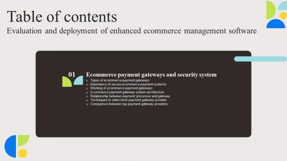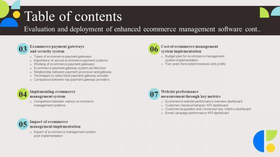 Here you can discover an assortment of the finest PowerPoint and Google Slides templates. With these templates, you can create presentations for a variety of purposes while simultaneously providing your audience with an eye catching visual experience. Download Table Of Contents Evaluation And Deployment Of Enhanced Ecommerce Template Pdf to deliver an impeccable presentation. These templates will make your job of preparing presentations much quicker, yet still, maintain a high level of quality. Slidegeeks has experienced researchers who prepare these templates and write high quality content for you. Later on, you can personalize the content by editing the Table Of Contents Evaluation And Deployment Of Enhanced Ecommerce Template Pdf. Our Table Of Contents Evaluation And Deployment Of Enhanced Ecommerce Template Pdf are topically designed to provide an attractive backdrop to any subject. Use them to look like a presentation pro.