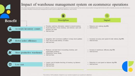 This slide represents the importance of an effective warehouse management system in reducing the human errors and proactive management of stocks with complete accuracy and effectiveness. It includes benefits of warehouse management system such as better order efficiency, less cost etc. This modern and well arranged Impact Of Warehouse Management Evaluation And Deployment Of Enhanced Rules Pdf provides lots of creative possibilities. It is very simple to customize and edit with the Powerpoint Software. Just drag and drop your pictures into the shapes. All facets of this template can be edited with Powerpoint no extra software is necessary. Add your own material, put your images in the places assigned for them, adjust the colors, and then you can show your slides to the world, with an animated slide included. This slide represents the importance of an effective warehouse management system in reducing the human errors and proactive management of stocks with complete accuracy and effectiveness. It includes benefits of warehouse management system such as better order efficiency, less cost etc.