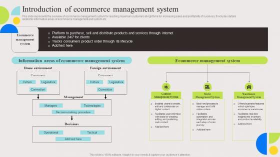 This slide represents the overview of ecommerce management system for reaching maximum customers at right time for increasing sales and profitability of business. It includes details related to information areas of ecommerce management and system etc. The best PPT templates are a great way to save time, energy, and resources. Slidegeeks have 100 percent editable powerpoint slides making them incredibly versatile. With these quality presentation templates, you can create a captivating and memorable presentation by combining visually appealing slides and effectively communicating your message. Download Introduction Of Ecommerce Evaluation And Deployment Of Enhanced Elements Pdf from Slidegeeks and deliver a wonderful presentation. This slide represents the overview of ecommerce management system for reaching maximum customers at right time for increasing sales and profitability of business. It includes details related to information areas of ecommerce management and system etc.