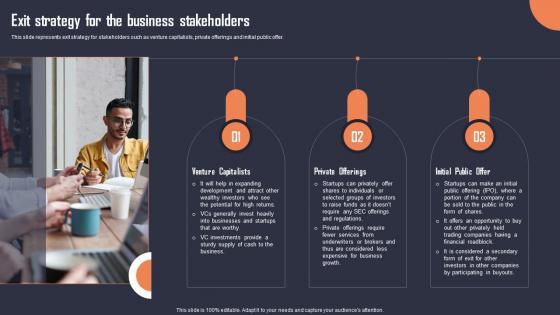 This slide represents exit strategy for stakeholders such as venture capitalists, private offerings and initial public offer. Do you know about Slidesgeeks Exit Strategy For The Business Stakeholders Building An Insurance Company Diagrams Pdf These are perfect for delivering any kind od presentation. Using it, create PowerPoint presentations that communicate your ideas and engage audiences. Save time and effort by using our pre-designed presentation templates that are perfect for a wide range of topic. Our vast selection of designs covers a range of styles, from creative to business, and are all highly customizable and easy to edit. Download as a PowerPoint template or use them as Google Slides themes. This slide represents exit strategy for stakeholders such as venture capitalists, private offerings and initial public offer.
