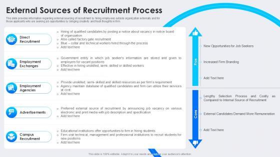 Do you have an important presentation coming up Are you looking for something that will make your presentation stand out from the rest Look no further than External Sources Of Recruitment Process Enhancing New Recruit Enrollment. With our professional designs, you can trust that your presentation will pop and make delivering it a smooth process. And with Slidegeeks, you can trust that your presentation will be unique and memorable. So why wait Grab External Sources Of Recruitment Process Enhancing New Recruit Enrollment today and make your presentation stand out from the rest This slide highlights external recruitment sourcing, focusing on hiring talent from outside the organization. It emphasizes bringing in creative individuals with fresh perspectives, providing job opportunities to applicants eager to contribute new ideas and drive innovation within the company.