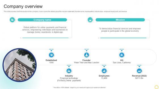 This slide provides brief introduction to the company. It also covers the details about the mission statement, founder name, headquarters, industry type, employee headcount, and revenue. Boost your pitch with our creative Company Overview Online Transaction Facilitator Business Model BMC SS V. Deliver an awe-inspiring pitch that will mesmerize everyone. Using these presentation templates you will surely catch everyones attention. You can browse the ppts collection on our website. We have researchers who are experts at creating the right content for the templates. So you do not have to invest time in any additional work. Just grab the template now and use them. This slide provides brief introduction to the company. It also covers the details about the mission statement, founder name, headquarters, industry type, employee headcount, and revenue.