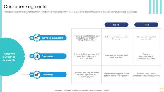 This slide showcases the various targeted customer segments of the company, along with their needs and pain points. It segments customers as individual consumers, businesses, and developers. Want to ace your presentation in front of a live audience Our Customer Segments Online Transaction Facilitator Business Model BMC SS V can help you do that by engaging all the users towards you. Slidegeeks experts have put their efforts and expertise into creating these impeccable powerpoint presentations so that you can communicate your ideas clearly. Moreover, all the templates are customizable, and easy-to-edit and downloadable. Use these for both personal and commercial use. This slide showcases the various targeted customer segments of the company, along with their needs and pain points. It segments customers as individual consumers, businesses, and developers.
