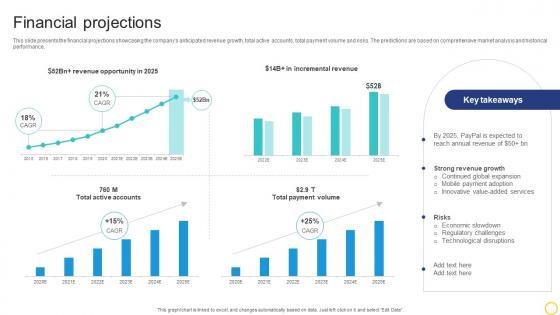 This slide presents the financial projections showcasing the companys anticipated revenue growth, total active accounts, total payment volume and risks. The predictions are based on comprehensive market analysis and historical performance. There are so many reasons you need a Financial Projections Online Transaction Facilitator Business Model BMC SS V. The first reason is you can not spend time making everything from scratch, Thus, Slidegeeks has made presentation templates for you too. You can easily download these templates from our website easily. This slide presents the financial projections showcasing the companys anticipated revenue growth, total active accounts, total payment volume and risks. The predictions are based on comprehensive market analysis and historical performance.