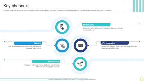 This slide showcases the various touch points the company connects with its customers. It includes channels such as websites, mobile applications, Api integration and partnerships. From laying roadmaps to briefing everything in detail, our templates are perfect for you. You can set the stage with your presentation slides. All you have to do is download these easy-to-edit and customizable templates. Key Channels Online Transaction Facilitator Business Model BMC SS V will help you deliver an outstanding performance that everyone would remember and praise you for. Do download this presentation today. This slide showcases the various touch points the company connects with its customers. It includes channels such as websites, mobile applications, Api integration and partnerships.