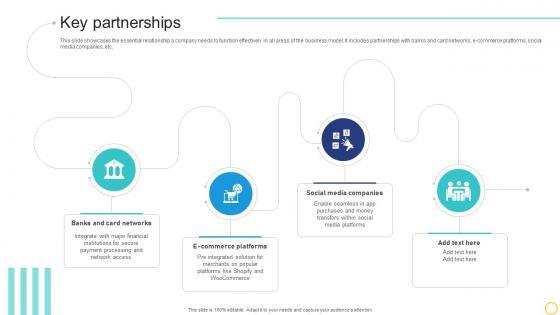 This slide showcases the essential relationship a company needs to function effectively in all areas of the business model. It includes partnerships with banks and card networks, e-commerce platforms, social media companies, etc. Present like a pro with Key Partnerships Online Transaction Facilitator Business Model BMC SS V. Create beautiful presentations together with your team, using our easy-to-use presentation slides. Share your ideas in real-time and make changes on the fly by downloading our templates. So whether you are in the office, on the go, or in a remote location, you can stay in sync with your team and present your ideas with confidence. With Slidegeeks presentation got a whole lot easier. Grab these presentations today. This slide showcases the essential relationship a company needs to function effectively in all areas of the business model. It includes partnerships with banks and card networks, e-commerce platforms, social media companies, etc.