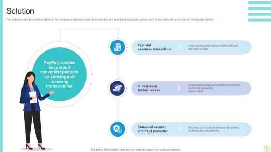 This slide provides the solutions offered by the company to address issues. It includes fast and seamless transactions, global reach for business, enhanced security and fraud protection. If your project calls for a presentation, then Slidegeeks is your go-to partner because we have professionally designed, easy-to-edit templates that are perfect for any presentation. After downloading, you can easily edit Solution Online Transaction Facilitator Business Model BMC SS V and make the changes accordingly. You can rearrange slides or fill them with different images. Check out all the handy templates This slide provides the solutions offered by the company to address issues. It includes fast and seamless transactions, global reach for business, enhanced security and fraud protection.