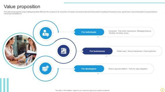 This slide showcases the unique selling proposition offered by the company to its customers. It includes convenience, fast online transactions sending and receiving money, global reach, secure transactions, fraud protections, robust payment platforms. Are you in need of a template that can accommodate all of your creative concepts This one is crafted professionally and can be altered to fit any style. Use it with Google Slides or PowerPoint. Include striking photographs, symbols, depictions, and other visuals. Fill, move around, or remove text boxes as desired. Test out color palettes and font mixtures. Edit and save your work, or work with colleagues. Download Value Proposition Online Transaction Facilitator Business Model BMC SS V and observe how to make your presentation outstanding. Give an impeccable presentation to your group and make your presentation unforgettable. This slide showcases the unique selling proposition offered by the company to its customers. It includes convenience, fast online transactions sending and receiving money, global reach, secure transactions, fraud protections, robust payment platforms.