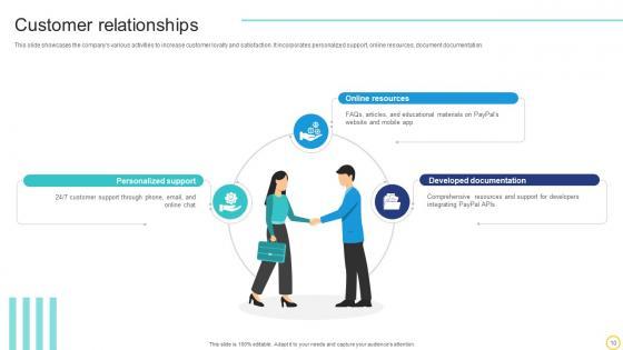 This slide showcases the companys various activities to increase customer loyalty and satisfaction. It incorporates personalized support, online resources, document documentation. Slidegeeks is one of the best resources for PowerPoint templates. You can download easily and regulate Customer Relationships Online Transaction Facilitator Business Model BMC SS V for your personal presentations from our wonderful collection. A few clicks is all it takes to discover and get the most relevant and appropriate templates. Use our Templates to add a unique zing and appeal to your presentation and meetings. All the slides are easy to edit and you can use them even for advertisement purposes. This slide showcases the companys various activities to increase customer loyalty and satisfaction. It incorporates personalized support, online resources, document documentation.