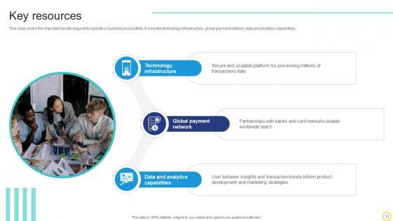 This slide covers the important assets required to operate a business successfully. It includes technology infrastructure, global payment network, data and analytics capabilities. Slidegeeks is here to make your presentations a breeze with Key Resources Online Transaction Facilitator Business Model BMC SS V With our easy-to-use and customizable templates, you can focus on delivering your ideas rather than worrying about formatting. With a variety of designs to choose from, you are sure to find one that suits your needs. And with animations and unique photos, illustrations, and fonts, you can make your presentation pop. So whether you are giving a sales pitch or presenting to the board, make sure to check out Slidegeeks first This slide covers the important assets required to operate a business successfully. It includes technology infrastructure, global payment network, data and analytics capabilities.