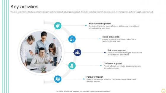 This slide covers the most curtailed activity the company performs to operate a business successfully. It includes product development, fraud prevention, risk management, customer support, partner outreach. Get a simple yet stunning designed Key Activities Online Transaction Facilitator Business Model BMC SS V. It is the best one to establish the tone in your meetings. It is an excellent way to make your presentations highly effective. So, download this PPT today from Slidegeeks and see the positive impacts. Our easy-to-edit Key Activities Online Transaction Facilitator Business Model BMC SS V can be your go-to option for all upcoming conferences and meetings. So, what are you waiting for Grab this template today. This slide covers the most curtailed activity the company performs to operate a business successfully. It includes product development, fraud prevention, risk management, customer support, partner outreach.