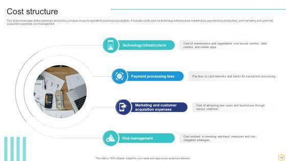 This slide showcases all the expenses and costs a company incurs to operate its business successfully. It includes costs such as technology infrastructure maintenance, payment processing fees, and marketing and customer acquisition expenses, risk management. Create an editable Cost Structure Online Transaction Facilitator Business Model BMC SS V that communicates your idea and engages your audience. Whether you are presenting a business or an educational presentation, pre-designed presentation templates help save time. Cost Structure Online Transaction Facilitator Business Model BMC SS V is highly customizable and very easy to edit, covering many different styles from creative to business presentations. Slidegeeks has creative team members who have crafted amazing templates. So, go and get them without any delay. This slide showcases all the expenses and costs a company incurs to operate its business successfully. It includes costs such as technology infrastructure maintenance, payment processing fees, and marketing and customer acquisition expenses, risk management.