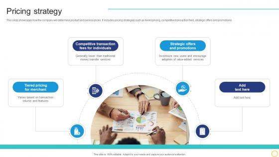 This slide showcases how the company will determine product and service prices. It includes pricing strategies such as tiered pricing, competitive transaction fees, strategic offers and promotions. Do you have an important presentation coming up Are you looking for something that will make your presentation stand out from the rest Look no further than Pricing Strategy Online Transaction Facilitator Business Model BMC SS V. With our professional designs, you can trust that your presentation will pop and make delivering it a smooth process. And with Slidegeeks, you can trust that your presentation will be unique and memorable. So why wait Grab Pricing Strategy Online Transaction Facilitator Business Model BMC SS V today and make your presentation stand out from the rest This slide showcases how the company will determine product and service prices. It includes pricing strategies such as tiered pricing, competitive transaction fees, strategic offers and promotions.