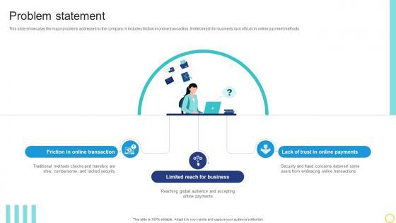 This slide showcases the major problems addressed by the company. It includes friction in online transaction, limited reach for business, lack of trust in online payment methods. Whether you have daily or monthly meetings, a brilliant presentation is necessary. Problem Statement Online Transaction Facilitator Business Model BMC SS V can be your best option for delivering a presentation. Represent everything in detail using Problem Statement Online Transaction Facilitator Business Model BMC SS V and make yourself stand out in meetings. The template is versatile and follows a structure that will cater to your requirements. All the templates prepared by Slidegeeks are easy to download and edit. Our research experts have taken care of the corporate themes as well. So, give it a try and see the results. This slide showcases the major problems addressed by the company. It includes friction in online transaction, limited reach for business, lack of trust in online payment methods.