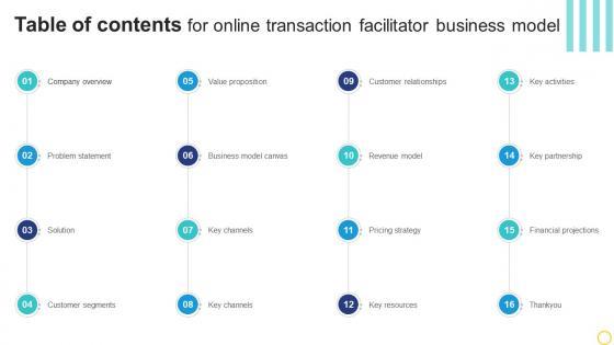 If you are looking for a format to display your unique thoughts, then the professionally designed Table Of Contents For Online Transaction Facilitator Business Model BMC SS V is the one for you. You can use it as a Google Slides template or a PowerPoint template. Incorporate impressive visuals, symbols, images, and other charts. Modify or reorganize the text boxes as you desire. Experiment with shade schemes and font pairings. Alter, share or cooperate with other people on your work. Download Table Of Contents For Online Transaction Facilitator Business Model BMC SS V and find out how to give a successful presentation. Present a perfect display to your team and make your presentation unforgettable. Our Table Of Contents For Online Transaction Facilitator Business Model BMC SS V are topically designed to provide an attractive backdrop to any subject. Use them to look like a presentation pro.