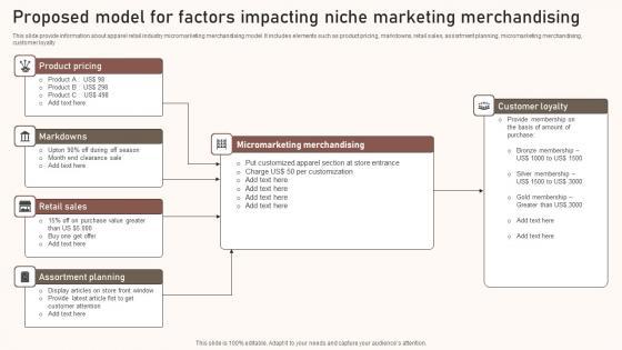 This slide provide information about apparel retail industry micromarketing merchandising model. It includes elements such as product pricing, markdowns, retail sales, assortment planning, micromarketing merchandising, customer loyalty Showcasing this set of slides titled Proposed Model For Factors Impacting Niche Marketing Merchandising Sample Pdf. The topics addressed in these templates are Merchandising, Customer Loyalty, Product Pricing. All the content presented in this PPT design is completely editable. Download it and make adjustments in color, background, font etc. as per your unique business setting. This slide provide information about apparel retail industry micromarketing merchandising model. It includes elements such as product pricing, markdowns, retail sales, assortment planning, micromarketing merchandising, customer loyalty