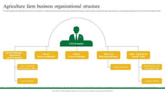 The slide highlights the organizational hierarchy in the company. It includes the chief executing officer, sales and marketing manager, finance manager, supply chain head, sales executive, warehousing and packaging staff, farm workers, and logistics officer. Crafting an eye catching presentation has never been more straightforward. Let your presentation shine with this tasteful yet straightforward Agriculture Farm Business Agriculture Business Plan Go To Market Strategy Ideas Pdf template. It offers a minimalistic and classy look that is great for making a statement. The colors have been employed intelligently to add a bit of playfulness while still remaining professional. Construct the ideal Agriculture Farm Business Agriculture Business Plan Go To Market Strategy Ideas Pdf that effortlessly grabs the attention of your audience Begin now and be certain to wow your customers The slide highlights the organizational hierarchy in the company. It includes the chief executing officer, sales and marketing manager, finance manager, supply chain head, sales executive, warehousing and packaging staff, farm workers, and logistics officer.