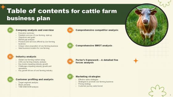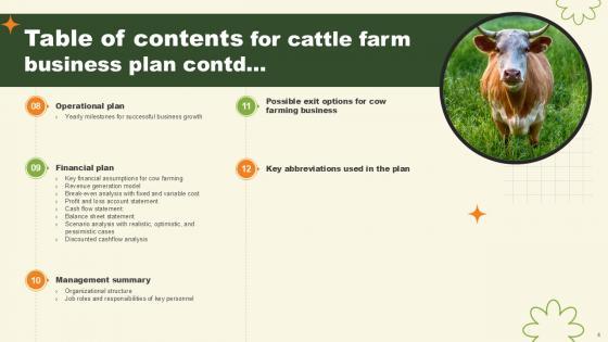 Ditch the Dull templates and opt for our engaging Cattle Farm Business Plan Ppt Presentation deck to attract your audience. Our visually striking design effortlessly combines creativity with functionality, ensuring your content shines through. Compatible with Microsoft versions and Google Slides, it offers seamless integration of presentation. Save time and effort with our pre-designed PPT layout, while still having the freedom to customize fonts, colors, and everything you ask for. With the ability to download in various formats like JPG, JPEG, and PNG, sharing your slides has never been easier. From boardroom meetings to client pitches, this deck can be the secret weapon to leaving a lasting impression. Our Cattle Farm Business Plan Ppt Presentation are topically designed to provide an attractive backdrop to any subject. Use them to look like a presentation pro.