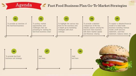 Find a pre-designed and impeccable Agenda Fast Food Business Plan Go To Market Strategies Ideas Pdf. The templates can ace your presentation without additional effort. You can download these easy-to-edit presentation templates to make your presentation stand out from others. So, what are you waiting for Download the template from Slidegeeks today and give a unique touch to your presentation. Our Agenda Fast Food Business Plan Go To Market Strategies Ideas Pdf are topically designed to provide an attractive backdrop to any subject. Use them to look like a presentation pro.