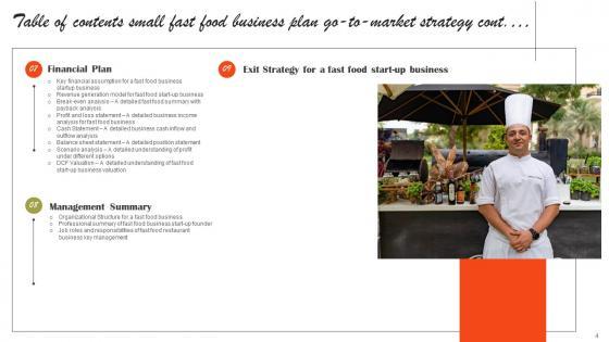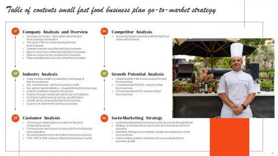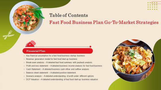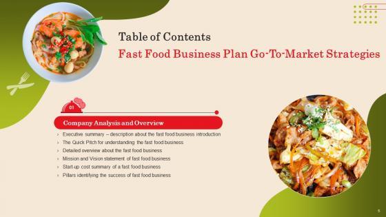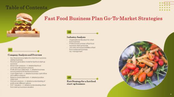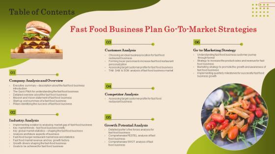 Slidegeeks is one of the best resources for PowerPoint templates. You can download easily and regulate Table Of Contents Fast Food Business Plan Go To Market Strategies Pictures Pdf for your personal presentations from our wonderful collection. A few clicks is all it takes to discover and get the most relevant and appropriate templates. Use our Templates to add a unique zing and appeal to your presentation and meetings. All the slides are easy to edit and you can use them even for advertisement purposes. Our Table Of Contents Fast Food Business Plan Go To Market Strategies Pictures Pdf are topically designed to provide an attractive backdrop to any subject. Use them to look like a presentation pro.