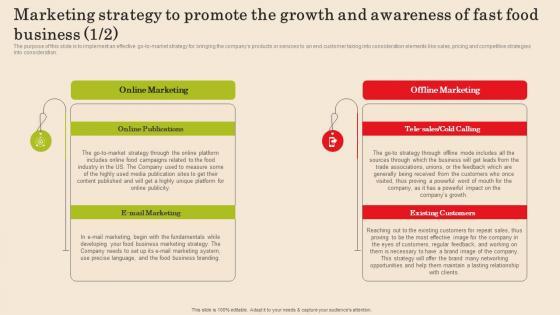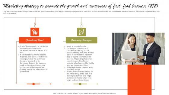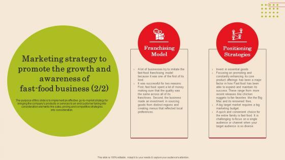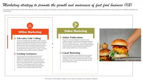 The purpose of this slide is to implement an effective go to market strategy for bringing the companys products or services to an end customer taking into consideration elements like sales, pricing and competitive strategies into consideration.The Marketing Strategy To Promote The Growth And Small Fast Food Business Plan Designs Pdf is a compilation of the most recent design trends as a series of slides. It is suitable for any subject or industry presentation, containing attractive visuals and photo spots for businesses to clearly express their messages. This template contains a variety of slides for the user to input data, such as structures to contrast two elements, bullet points, and slides for written information. Slidegeeks is prepared to create an impression. The purpose of this slide is to implement an effective go to market strategy for bringing the companys products or services to an end customer taking into consideration elements like sales, pricing and competitive strategies into consideration.