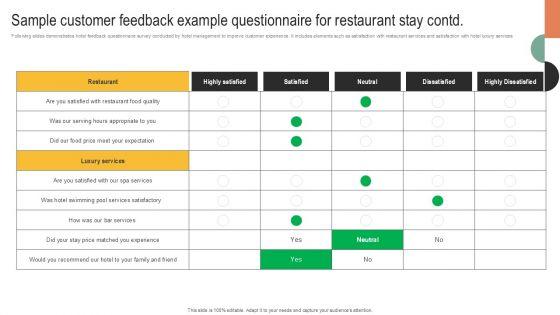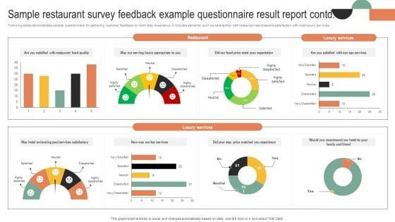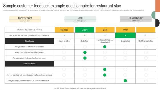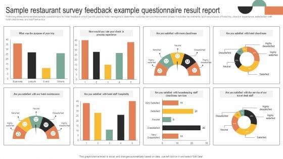 Following slides demonstrates sample questionnaire for hotel feedback which can be used by hotel managers to determine customer service improvement areas. It includes key elements such as purpose of hotel trip, check in experience, satisfaction with hotel cleanliness, and staff behaviour. Pitch your topic with ease and precision using this Sample Restaurant Survey Feedback Example Questionnaire Result Report Survey SS. This layout presents information on Maintenance, Staff Hospitality, Cleanliness Services . It is also available for immediate download and adjustment. So, changes can be made in the color, design, graphics or any other component to create a unique layout.