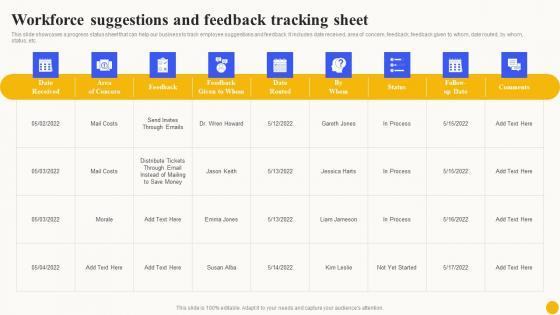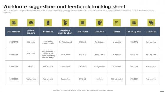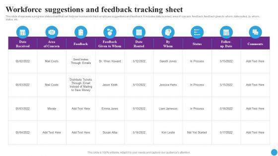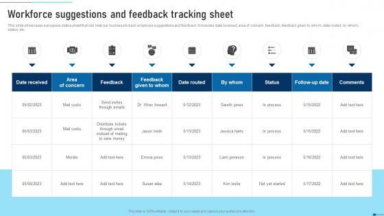 This slide showcases a progress status sheet that can help our business to track employee suggestions and feedback. It includes date received, area of concern, feedback, feedback given to whom, date routed, by whom, status, etc.Do you know about Slidesgeeks Workforce Suggestions And Feedback Planned Workforce Enhancement Professional Pdf These are perfect for delivering any kind od presentation. Using it, create PowerPoint presentations that communicate your ideas and engage audiences. Save time and effort by using our pre-designed presentation templates that are perfect for a wide range of topic. Our vast selection of designs covers a range of styles, from creative to business, and are all highly customizable and easy to edit. Download as a PowerPoint template or use them as Google Slides themes. This slide showcases a progress status sheet that can help our business to track employee suggestions and feedback. It includes date received, area of concern, feedback, feedback given to whom, date routed, by whom, status, etc.