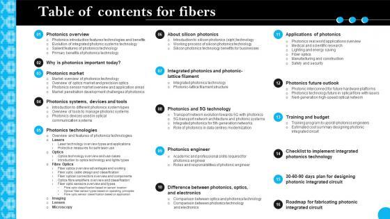 The best PPT templates are a great way to save time, energy, and resources. Slidegeeks have 100 percent editable powerpoint slides making them incredibly versatile. With these quality presentation templates, you can create a captivating and memorable presentation by combining visually appealing slides and effectively communicating your message. Download Table Of Contents Fibers Ppt File Infographic Template from Slidegeeks and deliver a wonderful presentation. Our Table Of Contents Fibers Ppt File Infographic Template are topically designed to provide an attractive backdrop to any subject. Use them to look like a presentation pro.