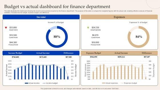 The slide illustrates the dashboard showing the income and expenses incurred by the finance department. The purpose of this slide is compare the budgeted figures with the actual cost, enabling effective analysis of financial activities. It include income budget, expense budget, and difference. Showcasing this set of slides titled Budget Vs Actual Dashboard For Finance Department Brochure PDF. The topics addressed in these templates are Income, Expenses, Expense Budget. All the content presented in this PPT design is completely editable. Download it and make adjustments in color, background, font etc. as per your unique business setting.