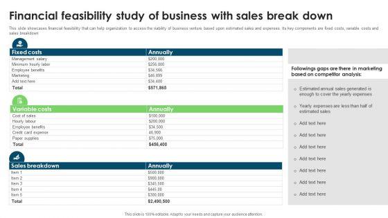This slide showcases financial feasibility that can help organization to access the viability of business venture based upon estimated sales and expenses. Its key components are fixed costs, variable costs and sales breakdown Pitch your topic with ease and precision using this Financial Feasibility Study Of Business With Sales Break Down Information PDF. This layout presents information on Competitor Analysis, Expenses, Estimated Sales. It is also available for immediate download and adjustment. So, changes can be made in the color, design, graphics or any other component to create a unique layout.