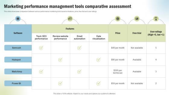 This slide showcases comparison between various performance monitoring tools based on features, price, free trial and user ratings. Slidegeeks has constructed Marketing Project Performance Benchmarking Marketing Performance Management CRP SS V after conducting extensive research and examination. These presentation templates are constantly being generated and modified based on user preferences and critiques from editors. Here, you will find the most attractive templates for a range of purposes while taking into account ratings and remarks from users regarding the content. This is an excellent jumping-off point to explore our content and will give new users an insight into our top-notch PowerPoint Templates. This slide showcases comparison between various performance monitoring tools based on features, price, free trial and user ratings.
