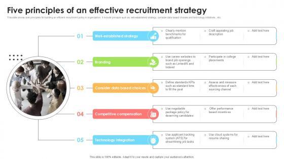 This slide shows core principles for building an efficient recruitment policy in organization. It include principle such as well-established strategy, consider data based choices and technology initiatives , etc. If your project calls for a presentation, then Slidegeeks is your go-to partner because we have professionally designed, easy-to-edit templates that are perfect for any presentation. After downloading, you can easily edit Five Principles Of An Effective Recruitment Workforce Procurement And Aptitude Evaluation Ppt Template and make the changes accordingly. You can rearrange slides or fill them with different images. Check out all the handy templates This slide shows core principles for building an efficient recruitment policy in organization. It include principle such as well-established strategy, consider data based choices and technology initiatives , etc.