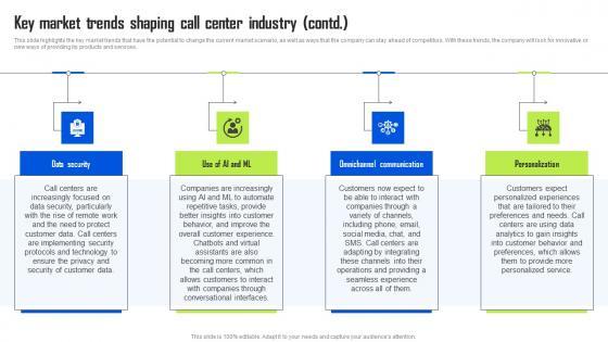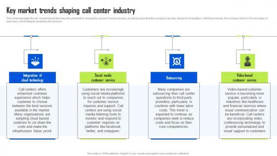 This slide highlights the key market trends that have the potential to change the current market scenario, as well as ways that the company can stay ahead of competitors. With these trends, the company will look for innovative or new ways of providing its products and services. Presenting this PowerPoint presentation, titled Key Market Trends Shaping Call Center Industry IT And Tech Support Business Microsoft Pdf with topics curated by our researchers after extensive research. This editable presentation is available for immediate download and provides attractive features when used. Download now and captivate your audience. Presenting this Key Market Trends Shaping Call Center Industry IT And Tech Support Business Microsoft Pdf Our researchers have carefully researched and created these slides with all aspects taken into consideration. This is a completely customizable Key Market Trends Shaping Call Center Industry IT And Tech Support Business Microsoft Pdf that is available for immediate downloading. Download now and make an impact on your audience. Highlight the attractive features available with our PPTs. This slide highlights the key market trends that have the potential to change the current market scenario, as well as ways that the company can stay ahead of competitors. With these trends, the company will look for innovative or new ways of providing its products and services.