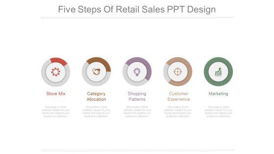 This is a five steps of retail sales ppt design. This is a five stage process. The stages in this process are store mix, category allocation, shopping patterns, customer experience, marketing.