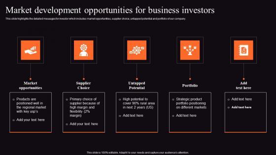 This slide highlights the detailed messages for investor which includes market opportunities, supplier choice, untapped potential and portfolio of our company. Create an editable Food Processing Business Profile Market Development Brochure Pdf that communicates your idea and engages your audience. Whether you are presenting a business or an educational presentation, pre designed presentation templates help save time. Food Processing Business Profile Market Development Brochure Pdf is highly customizable and very easy to edit, covering many different styles from creative to business presentations. Slidegeeks has creative team members who have crafted amazing templates. So, go and get them without any delay. This slide highlights the detailed messages for investor which includes market opportunities, supplier choice, untapped potential and portfolio of our company.