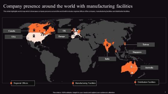 This slide highlights world map which showcases company presence around the world with includes regional offices of the company, manufacturing facilities and distribution facilities. The best PPT templates are a great way to save time, energy, and resources. Slidegeeks have 100 percent editable powerpoint slides making them incredibly versatile. With these quality presentation templates, you can create a captivating and memorable presentation by combining visually appealing slides and effectively communicating your message. Download Food Processing Business Profile Company Presence Around The World Formats Pdf from Slidegeeks and deliver a wonderful presentation. This slide highlights world map which showcases company presence around the world with includes regional offices of the company, manufacturing facilities and distribution facilities.