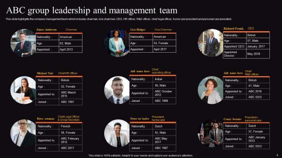 This slide highlights the company management team which includes chairman, vice chairman, CEO, HR officer, RandD officer, chief legal officer, home care president and personal care president. If your project calls for a presentation, then Slidegeeks is your go to partner because we have professionally designed, easy to edit templates that are perfect for any presentation. After downloading, you can easily edit Food Processing Business Profile ABC Group Leadership Management Mockup Pdf and make the changes accordingly. You can rearrange slides or fill them with different images. Check out all the handy templates This slide highlights the company management team which includes chairman, vice chairman, CEO, HR officer, RandD officer, chief legal officer, home care president and personal care president.