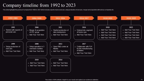 This slide highlights the journey of company from 1992 to 2021 which includes exports of personal care, setup production of oral care, merger and acquisition with various companies etc. Slidegeeks has constructed Food Processing Business Profile Company Timeline From 1992 To 2023 Template Pdf after conducting extensive research and examination. These presentation templates are constantly being generated and modified based on user preferences and critiques from editors. Here, you will find the most attractive templates for a range of purposes while taking into account ratings and remarks from users regarding the content. This is an excellent jumping off point to explore our content and will give new users an insight into our top notch PowerPoint Templates. This slide highlights the journey of company from 1992 to 2021 which includes exports of personal care, setup production of oral care, merger and acquisition with various companies etc.