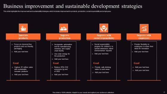 This slide highlights the improvement and sustainability strategies which includes improvement in products, production, social responsibility and employees. Formulating a presentation can take up a lot of effort and time, so the content and message should always be the primary focus. The visuals of the PowerPoint can enhance the presenters message, so our Food Processing Business Profile Business Improvement Sustainable Clipart Pdf was created to help save time. Instead of worrying about the design, the presenter can concentrate on the message while our designers work on creating the ideal templates for whatever situation is needed. Slidegeeks has experts for everything from amazing designs to valuable content, we have put everything into Food Processing Business Profile Business Improvement Sustainable Clipart Pdf This slide highlights the improvement and sustainability strategies which includes improvement in products, production, social responsibility and employees.