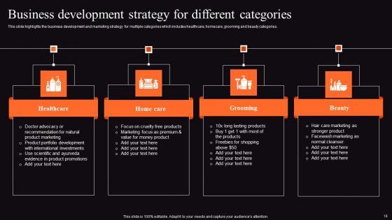 This slide highlights the business development and marketing strategy for multiple categories which includes healthcare, homecare, grooming and beauty categories. Make sure to capture your audiences attention in your business displays with our gratis customizable Food Processing Business Profile Business Development Strategy Different Background Pdf. These are great for business strategies, office conferences, capital raising or task suggestions. If you desire to acquire more customers for your tech business and ensure they stay satisfied, create your own sales presentation with these plain slides. This slide highlights the business development and marketing strategy for multiple categories which includes healthcare, homecare, grooming and beauty categories.