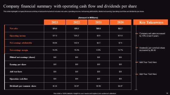 This slide highlights company financial summary in tabular format which includes net sales, operating income, net earning attributable, diluted net earning, operating cash flow and dividends per share. This Food Processing Business Profile Company Financial Summary Operating Demonstration Pdf is perfect for any presentation, be it in front of clients or colleagues. It is a versatile and stylish solution for organizing your meetings. The Food Processing Business Profile Company Financial Summary Operating Demonstration Pdf features a modern design for your presentation meetings. The adjustable and customizable slides provide unlimited possibilities for acing up your presentation. Slidegeeks has done all the homework before launching the product for you. So, do not wait, grab the presentation templates today This slide highlights company financial summary in tabular format which includes net sales, operating income, net earning attributable, diluted net earning, operating cash flow and dividends per share.