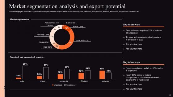 This slide highlights the market segmentation and export potential analysis which showcases baby care, fabric care, food products, hair care, household, and personal care items etc. Slidegeeks is one of the best resources for PowerPoint templates. You can download easily and regulate Food Processing Business Profile Market Segmentation Analysis Export Topics Pdf for your personal presentations from our wonderful collection. A few clicks is all it takes to discover and get the most relevant and appropriate templates. Use our Templates to add a unique zing and appeal to your presentation and meetings. All the slides are easy to edit and you can use them even for advertisement purposes. This slide highlights the market segmentation and export potential analysis which showcases baby care, fabric care, food products, hair care, household, and personal care items etc.