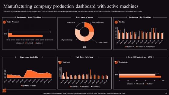This slide highlights the manufacturing company production dashboard which showcases production rate, lost units with causes, productivity by machine, operations available and overall productivity. Boost your pitch with our creative Food Processing Business Profile Manufacturing Company Production Clipart Pdf. Deliver an awe inspiring pitch that will mesmerize everyone. Using these presentation templates you will surely catch everyones attention. You can browse the ppts collection on our website. We have researchers who are experts at creating the right content for the templates. So you do not have to invest time in any additional work. Just grab the template now and use them. This slide highlights the manufacturing company production dashboard which showcases production rate, lost units with causes, productivity by machine, operations available and overall productivity.