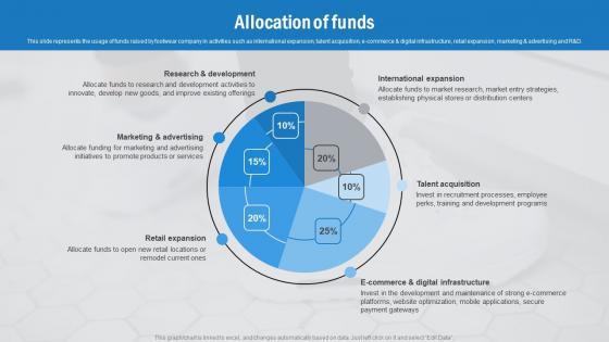 This slide represents the usage of funds raised by footwear company in activities such as international expansion, talent acquisition, e-commerce and digital infrastructure, retail expansion, marketing and advertising and R and D. Find a pre-designed and impeccable Allocation Of Funds Footwear Company Funding Elevator Pitch Deck Background Pdf. The templates can ace your presentation without additional effort. You can download these easy-to-edit presentation templates to make your presentation stand out from others. So, what are you waiting for Download the template from Slidegeeks today and give a unique touch to your presentation. This slide represents the usage of funds raised by footwear company in activities such as international expansion, talent acquisition, e-commerce and digital infrastructure, retail expansion, marketing and advertising and R and D.