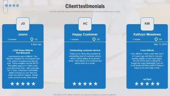 This slide represents glimpse of client testimonials provided by customers for the footwear company. Create an editable Client Testimonials Footwear Company Funding Elevator Pitch Deck Topics Pdf that communicates your idea and engages your audience. Whether you are presenting a business or an educational presentation, pre-designed presentation templates help save time. Client Testimonials Footwear Company Funding Elevator Pitch Deck Topics Pdf is highly customizable and very easy to edit, covering many different styles from creative to business presentations. Slidegeeks has creative team members who have crafted amazing templates. So, go and get them without any delay. This slide represents glimpse of client testimonials provided by customers for the footwear company.