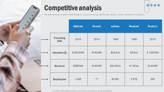 This slide represents competitor analysis footwear company showcasing founding date, valuation, revenue and number of employees. Want to ace your presentation in front of a live audience Our Competitive Analysis Footwear Company Funding Elevator Pitch Deck Professional Pdf can help you do that by engaging all the users towards you. Slidegeeks experts have put their efforts and expertise into creating these impeccable powerpoint presentations so that you can communicate your ideas clearly. Moreover, all the templates are customizable, and easy-to-edit and downloadable. Use these for both personal and commercial use. This slide represents competitor analysis footwear company showcasing founding date, valuation, revenue and number of employees.